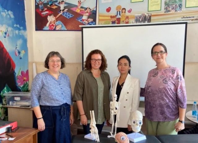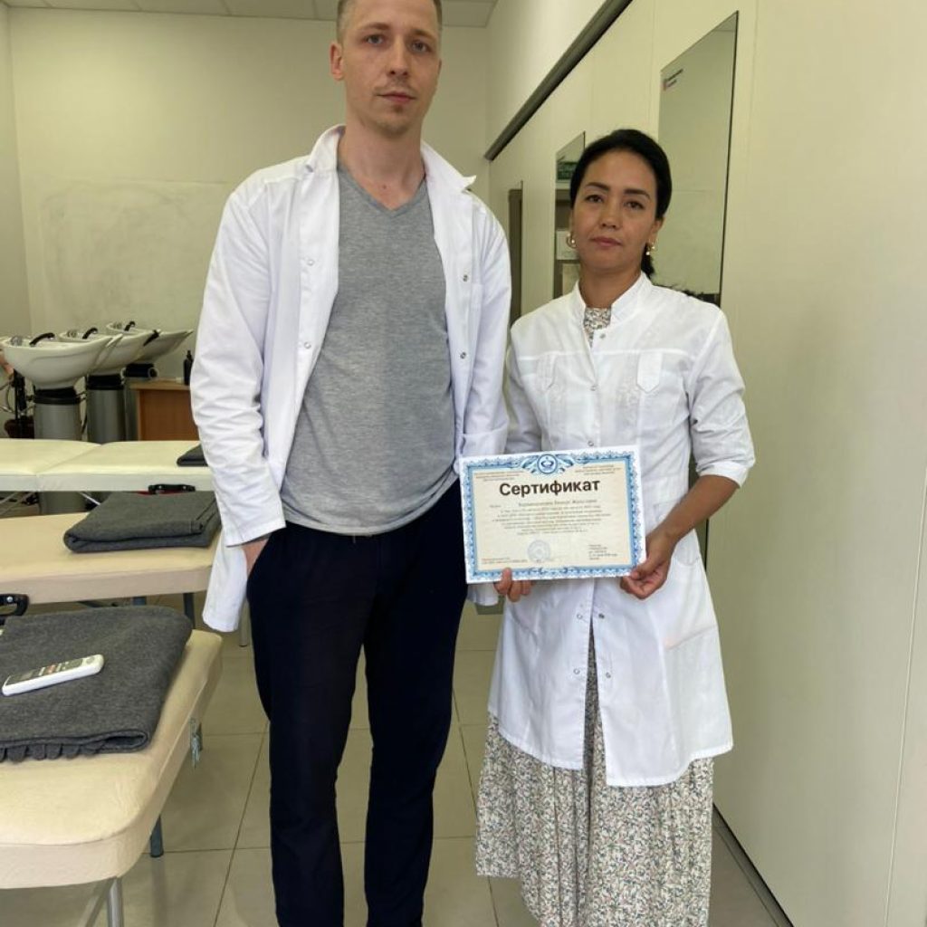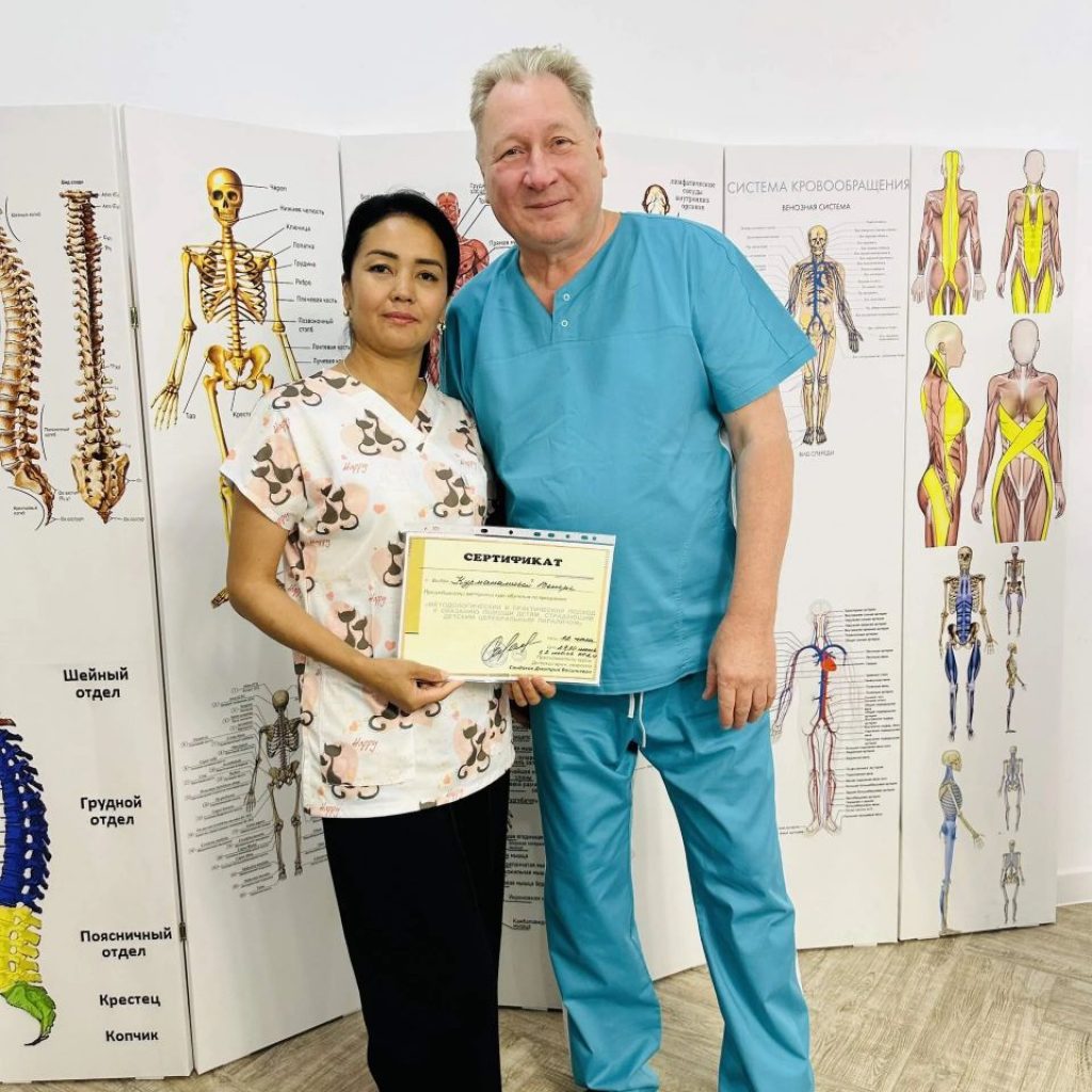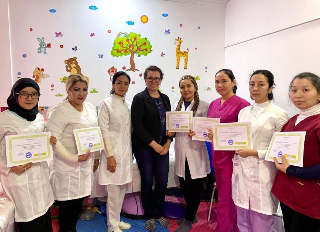 – Алгач 1 жылча өзүм жалгыз иштеп, андан кийин 4 кызды окутуп чыгардым. Азыр колумда физкабинеттеги кыздар менен 7 кыз иштейбиз. Биз менен чогуу өзүмдүн сиңдим Кызжибек Курбаналиева да иштейт. Ал Москва шаарындагы Е.Малышова клиникасынан окуп келген, ал учурда Ошко, Бишкекке 3 айда, 6 айда билимин жогорулатып турат, өзү педагог, логомассажды жасайт, ошону менен бирге дефектологду жана АВА-терапияны да кошо алып барат.Өзүм жыл сайын квалификацияны жогоруулатуу максатында Ташкент, Алма-Ата, Москва шаарларына барып окуулардан өтүп турам. Кыздарымды да Ошко окутууларга жөнөтүп турабыз. Ошондой эле Германия өлкөсүнөн келген физикалык терапевт, бобат-терапевт, волонтер -тренер Луиза Регерден эмгек жамаатыбыз менен 10 күндүк окуутудан өткөнбүз.